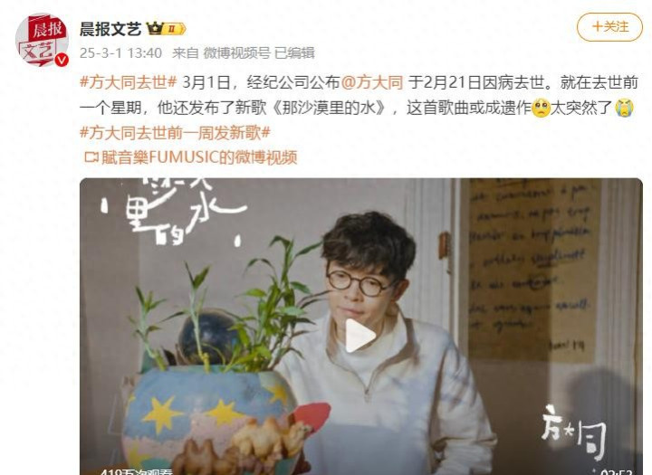 哎,最近网上炸开了锅,说方大同去世了!消息说他2月21日就没了,3月1日经纪公司才宣布,临走前一周还发了新歌《那沙漠里的水》,听起来…挺让人难受的。可等等,这真的靠谱吗?